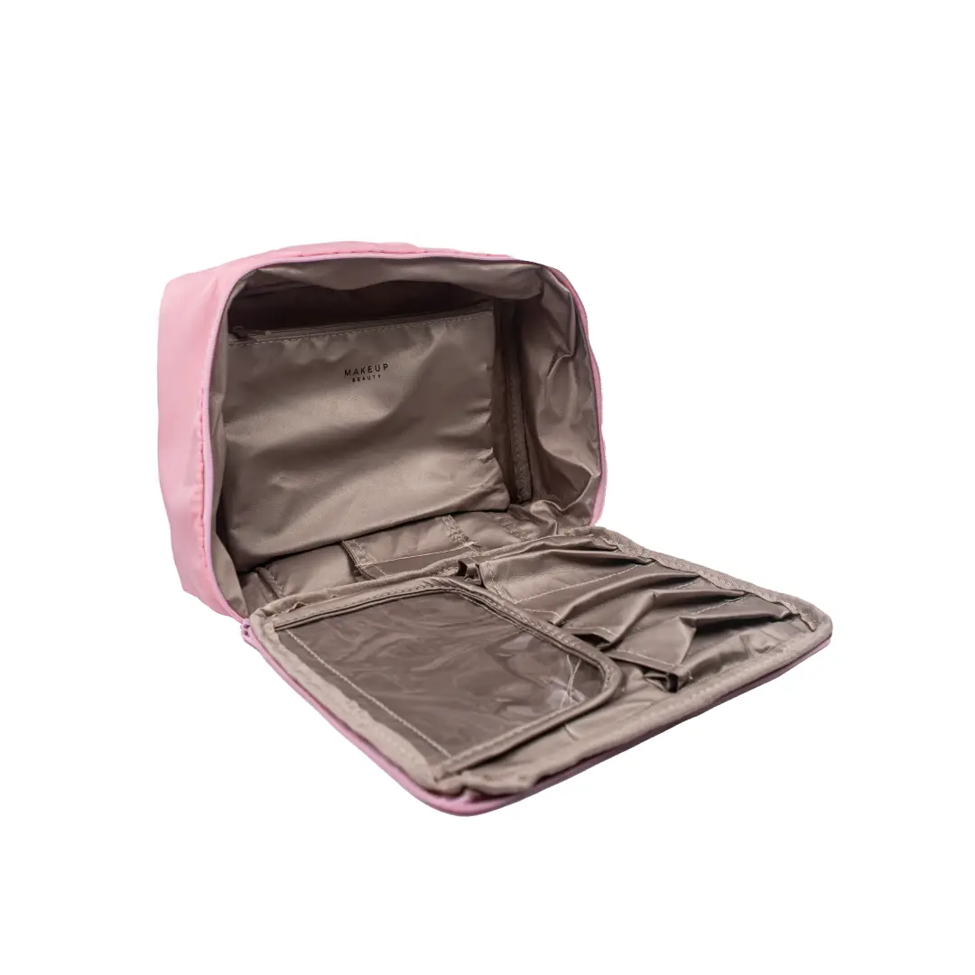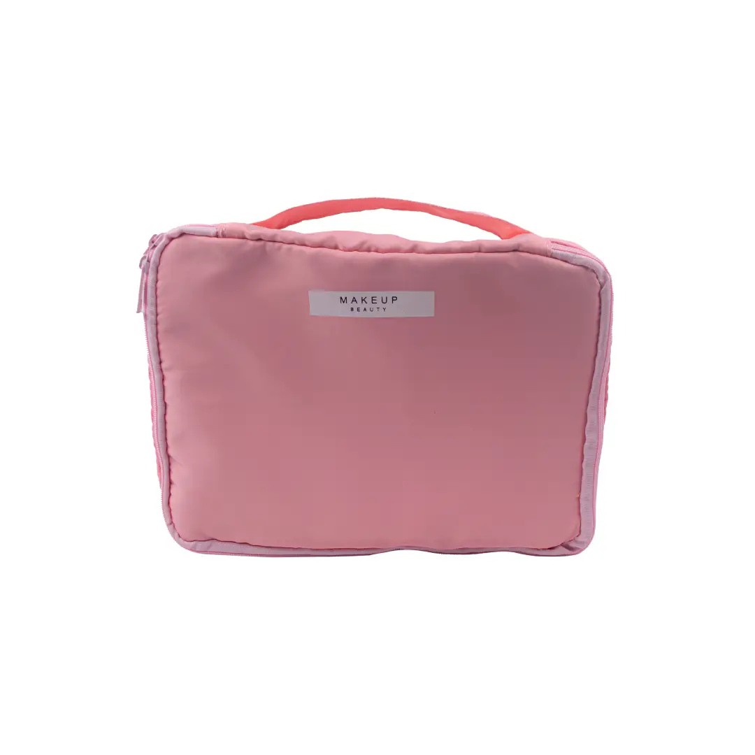 Cosmetiquera portátil de color rosa, ideal para guardar y transportar maquillaje y accesorios de forma práctica y organizada.