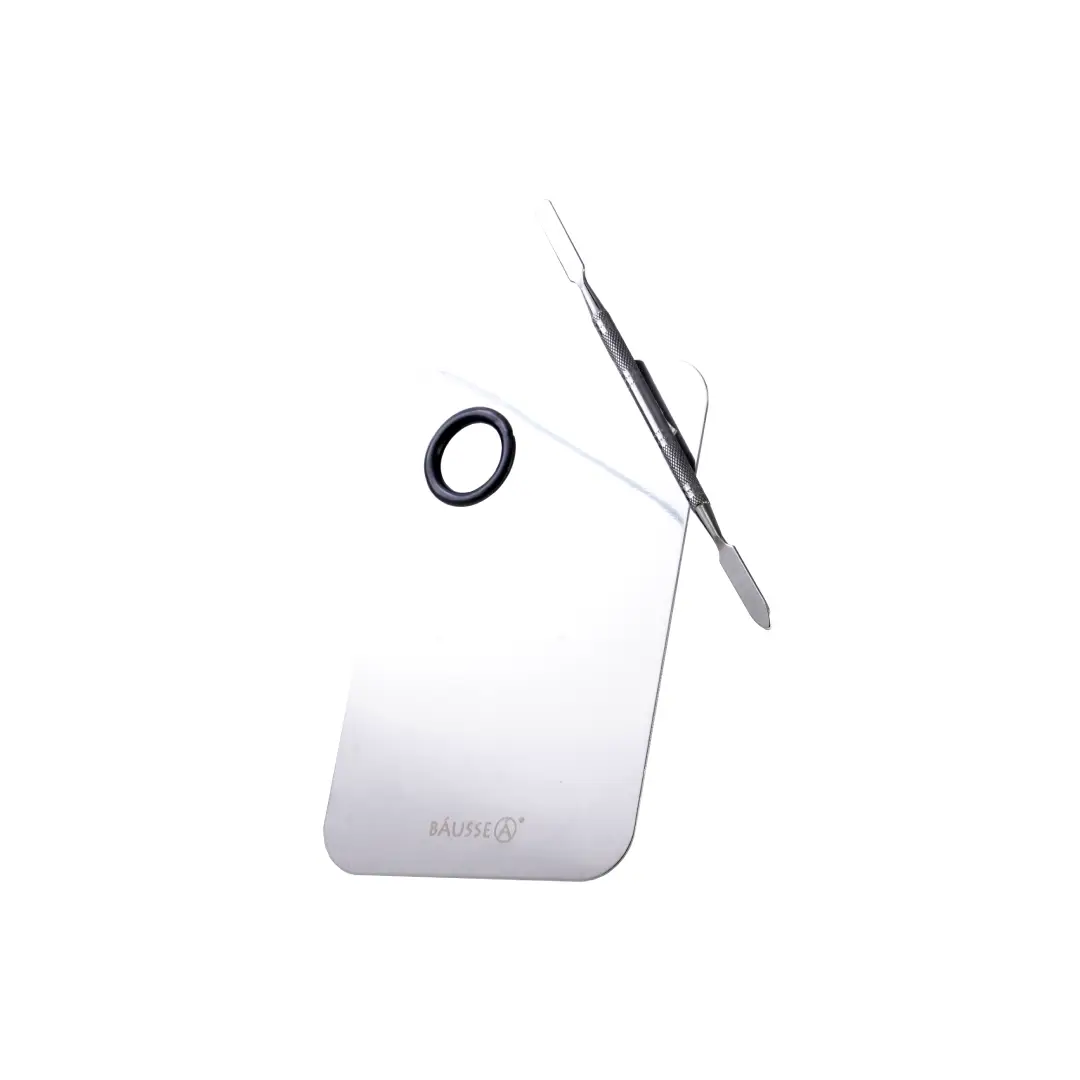 Paleta mezcladora para maquillaje, disponible en tamaños chica y grande, ideal para combinar bases, correctores y productos líquidos o cremosos.