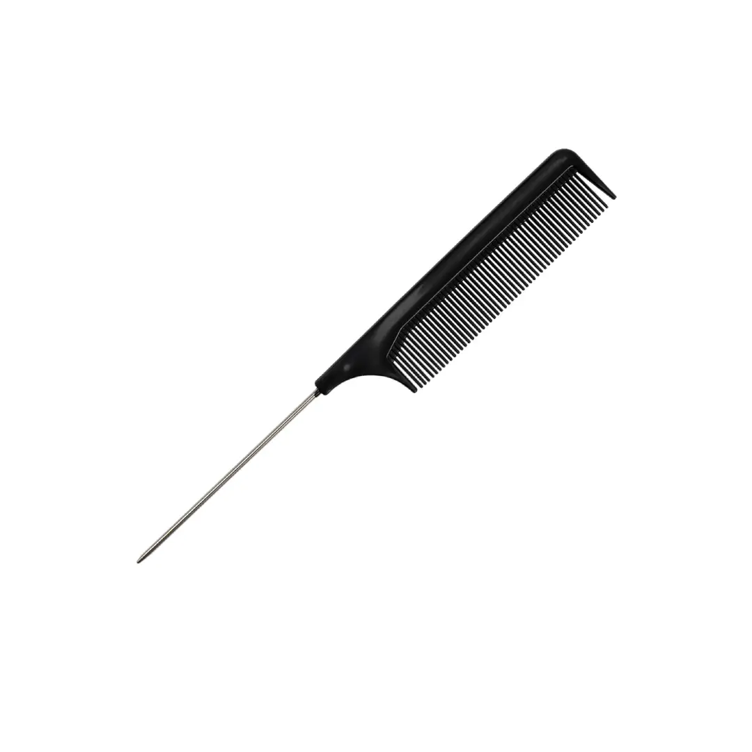 Peine profesional diseñado con una cola de acero inoxidable que permite separar el cabello con precisión y facilidad. Su estructura de plástico resistente y dientes finos facilita el peinado, alisado y aplicación de tratamientos capilares. Ideal para cortes, tintes, alaciados y peinados profesionales, garantizando control y precisión en cada movimiento. Perfecto para salones de belleza o uso personal.
